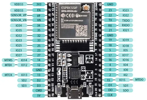 ESP32 diğer mikrodenetleyicilerle SPI, SDIO, I2C ve UART üzerinden haberleşebilir veya tamamen bağımsız çalışabilir. 32 adet GPIO pini (tamamı PWM destekli), SD kart bağlantısı, Wi-Fi ve Bluetooth (BR/EDR + BLE) desteği ile akıllı cihazlar, sensör sistemleri ve kablosuz iletişim projelerinde geniş kullanım alanı sunar.